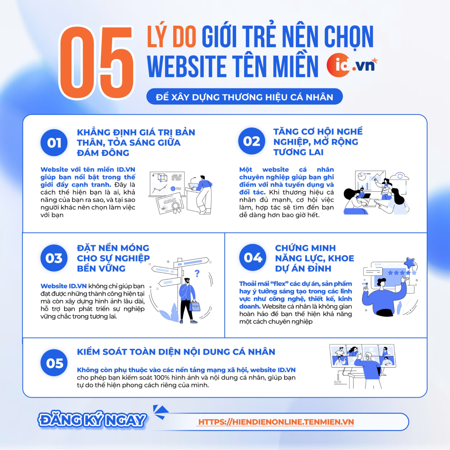 Trong thời đại mọi thứ đều có thể bị sao chép và thay đổi nhanh chóng, thương hiệu cá nhân chính là yếu tố giúp bạn nổi bật và khẳng định giá trị riêng biệt của mình. Một trong những cách hiệu quả mà các bạn trẻ ngày nay ưa chuộng, đó là xây dựng một trang web CV (giới thiệu bản thân) online chuyên nghiệp, sáng tạo và cá tính. Nắm bắt được xu hướng ấy, Bộ Thông tin và Truyền thông ban hành Quyết định số 826/QĐ-BTTTT ngày 21/5/2024, với nhiều ưu đãi cho học sinh, sinh viên khi thiết lập wesbite sử dụng tên miền "id.vn".
